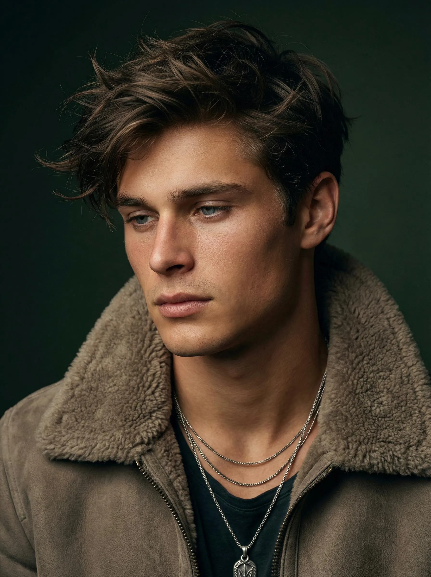Generate photorealistic portraits matching uploaded images exactly with vivago.ai's AI tools. Create detailed close-ups featuring messy wind-tousled hair, taupe suede shearling jackets, layered necklaces, and moody dark green backdrops. Achieve cinematic lighting, shallow depth of field, and ultra-detailed 8K fashion photography—commercial-ready with no watermarks.
