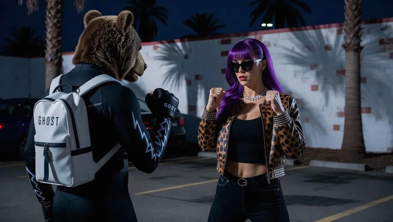 The foreground features the back of a man with a bear head, wearing a black wet suit adorned with long lightning printed along the sleeves, and a white backpack written "Ghost" on it. He faces a Caucasian woman with purple side-swept long hair, with her fists up in a boxing position, bare hands, wearing a leopard jacket over a black tank top, large rectangular black frame sunglasses, a diamond chain, and black jeans. Set in a dimly lit outdoor parking lot with a 2 meters tall white wall brick with dramatic shadows casting an eerie atmosphere. Palm trees. 4K, HD. Close up to the bear.
