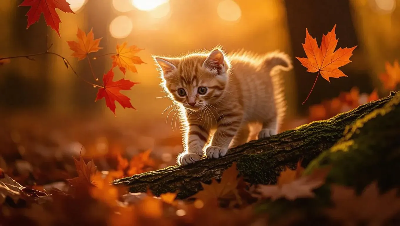 Discover AI-generated autumn forest scenes blending Studio Ghibli whimsy with hyper-realistic textures. Capture golden hour light on a fluffy ginger kitten exploring maple groves, velvety moss details, and fiery bokeh backgrounds. Perfect for nature photography lovers seeking magical realism in AI art.