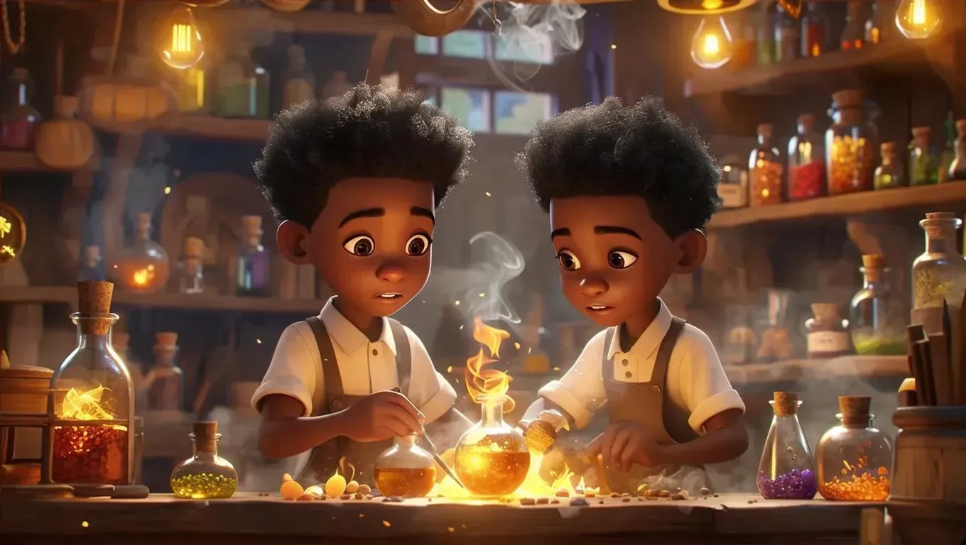 AI-generated Pixar-style 3D cartoon scene: Two young Black boys crafting potions in a magical lapidary workshop engulfed in fiery chaos. Dust-covered faces, smoky atmosphere, and whimsical confusion highlight AI-powered creativity for dynamic character design, mystical effects, and vivid storytelling. Explore AI tools for enchanting visuals, fantasy scenes, and professional-grade animated content.