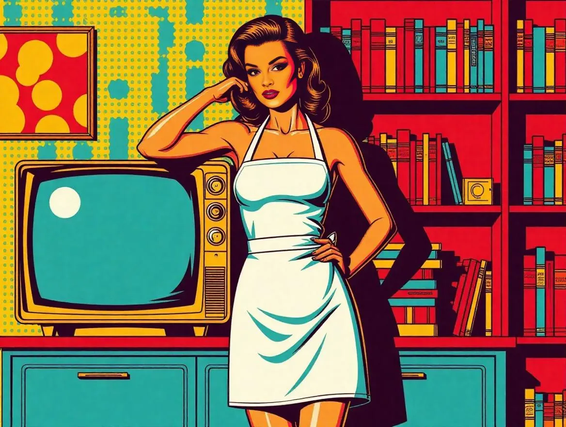 Generate retro comic art in 70's Googie style with flirty silvery white, dark blue, acid yellow, and maroon blur. Create an image of a girl in a naked apron posing next to a sci-fi room's TV & bookshelf. Explore AI effects for vintage aesthetics and grain dots static effects.