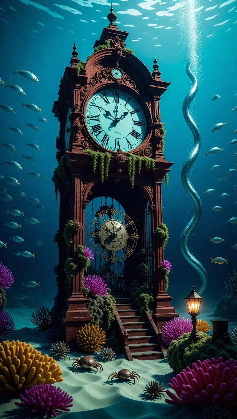 A majestic, rusted clocktower lies sideways on the ocean floor, draped in lush seaweed and vibrant coral. Time stands still as colorful fish swim through its intricate gears. Tiny merfolk illuminate the interior with lanterns fueled by glowing barnacles. Crabs adorned in top hats read from waterlogged scrolls near the remnants of shipwrecks now transformed into thriving coral reefs. A mesmerizing school of silver eels spirals through the bell tower, drawn to the haunting echo of time long forgotten. The sea glows a pale blue, bathed in the gentle moonlight filtering from the surface above.