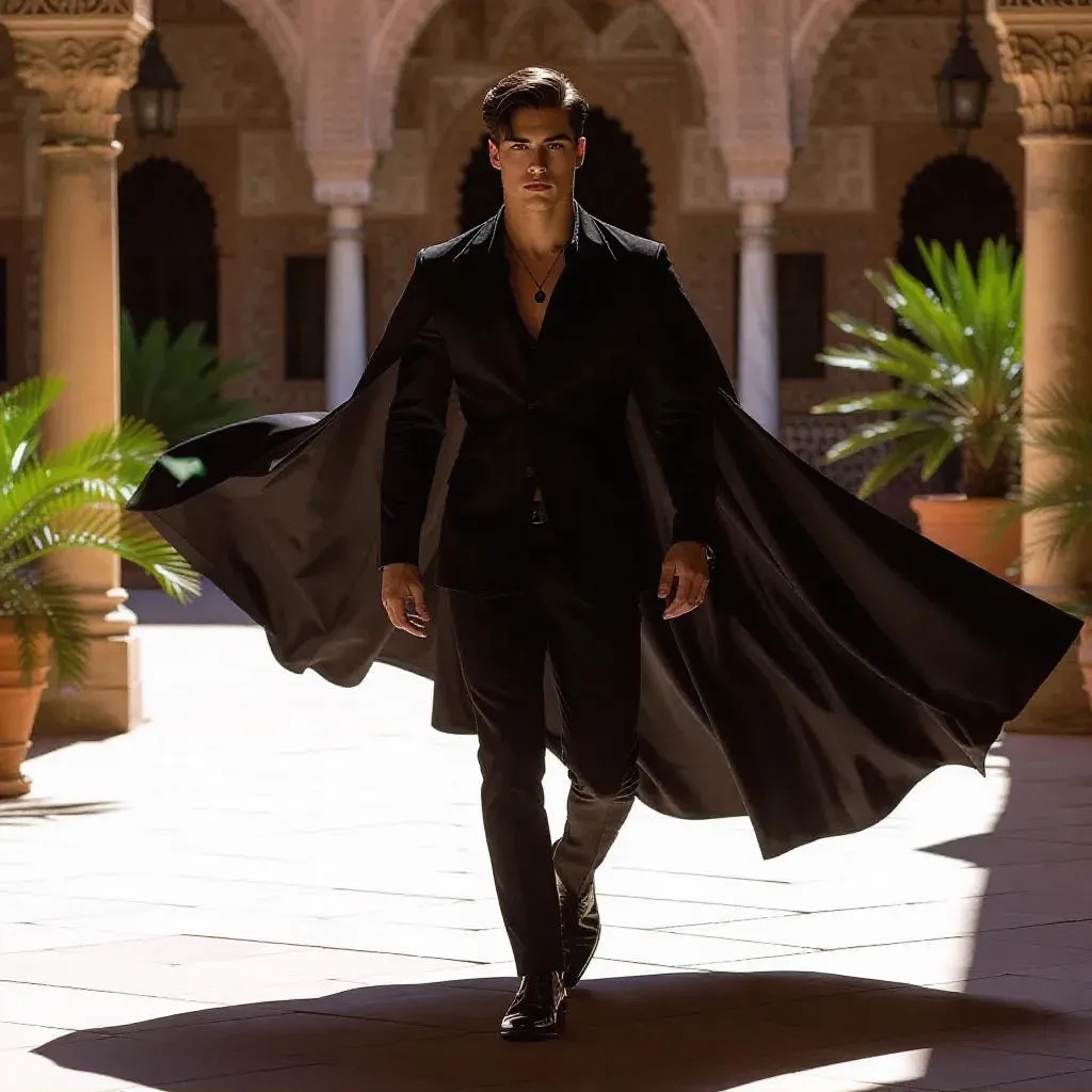 Studio photographic, 8k, hyper-realistic, cinematic, ultra-hyper realistic, photogenic, shaven, (((model Alberto Rosende shadowhunters))),Thomas Doherty, sex appeal, photorealistic, jet-black glossy cape,cape attached by black string, seductively striding ,casual streetwear,plaza,mysterious attraction,saloon,babylonian village garden, italian garden ,barcelona, wet and glossy cape,contrast, visual aesthetic, straight flat hanging cape,black suite,dapper, cape draped and spread out, model hunk, alternative pose, alternating pose, upscale, variation, glint, visually stunning, beefcake dreamboat, full body shot, cape billowing behind, alluring, dashing, defined upturned nose tip, refined face, looking sideways at the camera, alternating point of view, panoramic plaza, hidden alley, ultra-attractive, walking, organic cape movement, sun shining through the cape, detailed textured black silk cape.cape anckle length