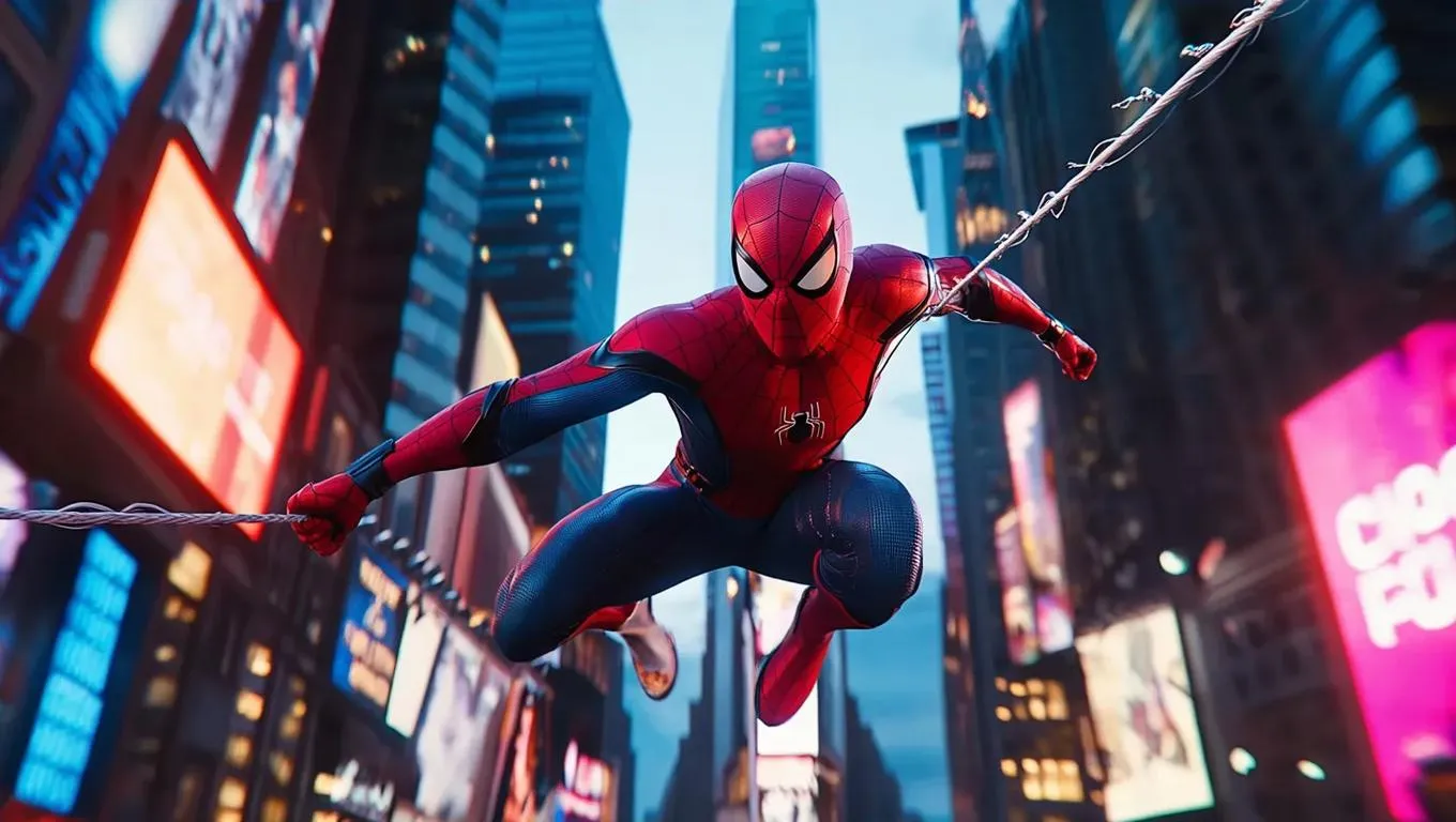 Generate Spider-Man swinging through neon-lit Times Square at dusk with photorealistic detail. Cinematic 8K visuals showcase intricate suit textures, dynamic motion blur, and vivid reflections on skyscrapers. AI transforms text prompts into immersive blockbuster scenes – perfect for movie-quality visuals, superhero art, and hyper-realistic digital storytelling.