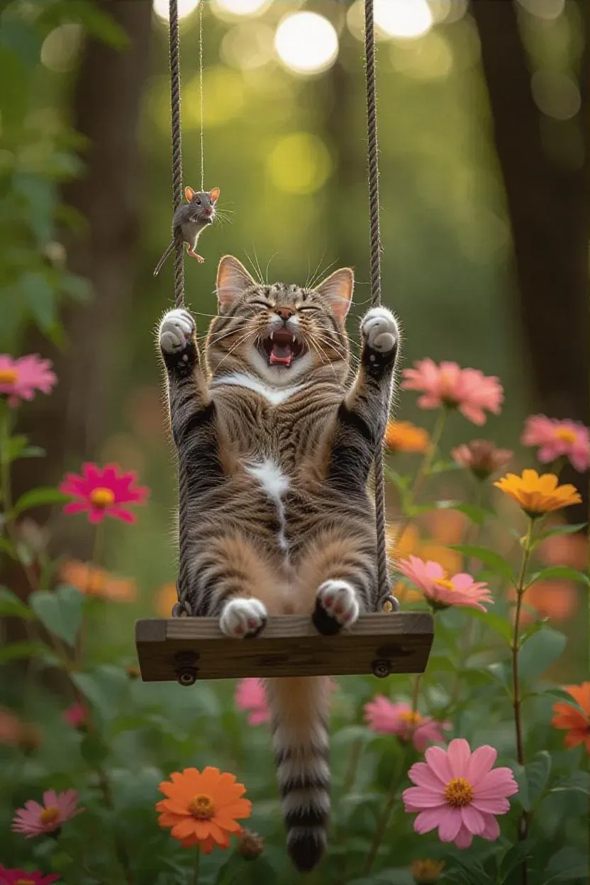 Generate a whimsical AI park scene with a playful cat swinging a laughing mouse on a swing. Create vibrant, animated visuals using Vivago.ai's creative tools for dynamic, laughter-filled moments. Perfect for unique, imaginative AI-generated art and professional-grade animations.