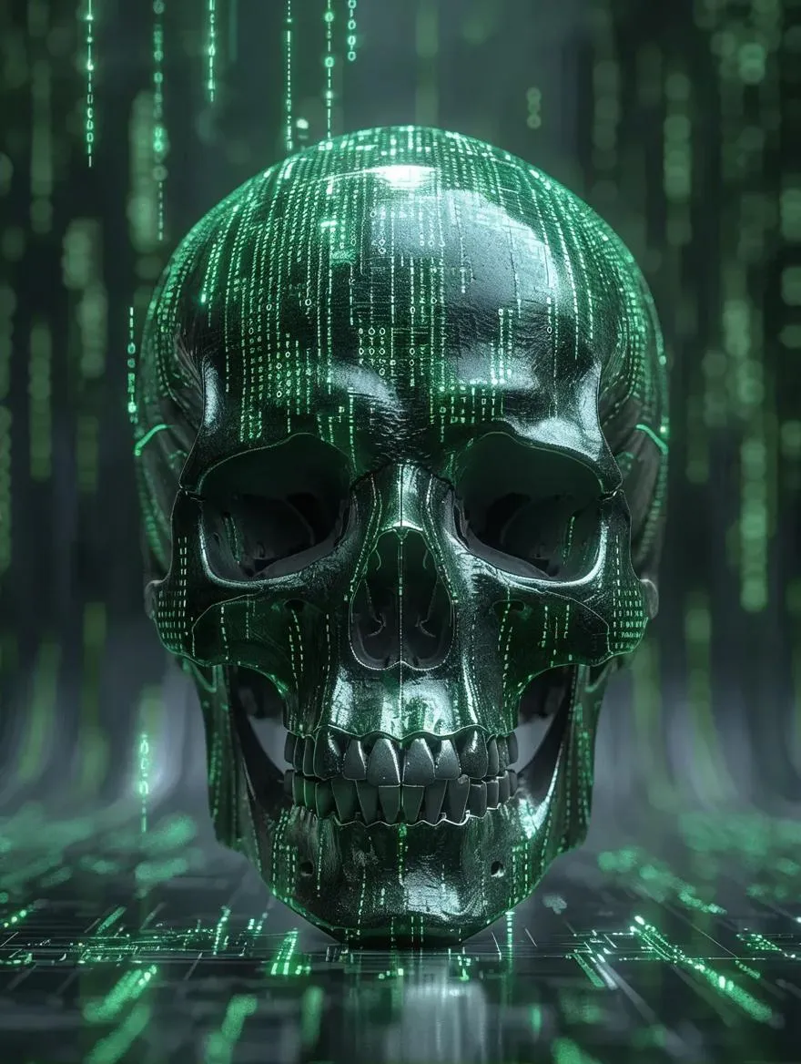 Generate a cyberpunk-inspired skull with neon-green digital code, glitch effects, and a futuristic Matrix aesthetic. AI-generated for precision, this high-resolution 3D render merges tech and mortality. Perfect for edgy digital art, album covers, or sci-fi themes. Transform text into striking visuals with VivaGo's AI tools.