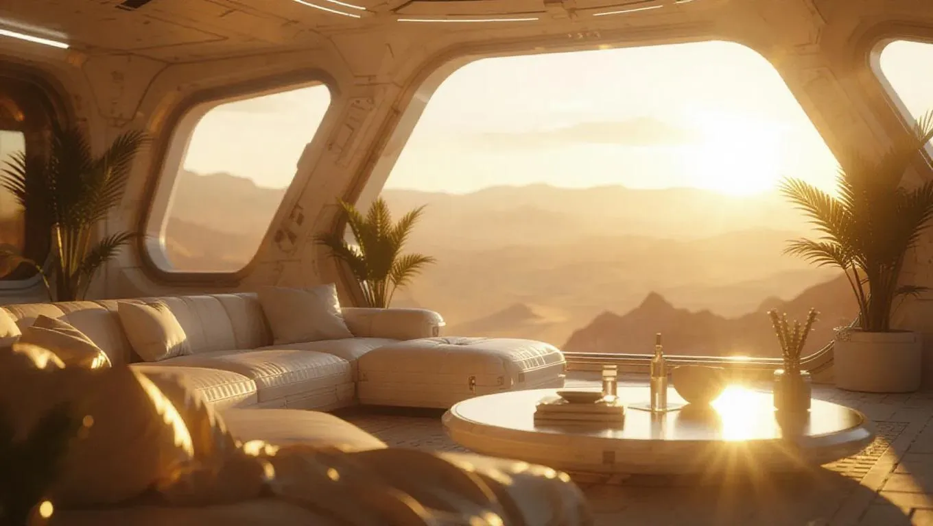 High quality, 8K, Ultra HD, Highly detailed, High contrast, Perfect and Detailed Environment, Perfect Furnitures and Furnishing, Perfect Cinematic close-up photo, sunset. Bionic style space station interior design on the alien planet surface: 1.0 > Beige futuristic high-tech bionic living room, SD2.1_2.1realismEngine_v10, close-up, hyper-detailed, sharp focus, studio photo, intricate details, sleek lines, minimalist aesthetic, metallic accents, daylight, reflective surfaces, soft shadows, ambient lighting, warm tones, futuristic flora, seamless integration, advanced technology, clean and polished.