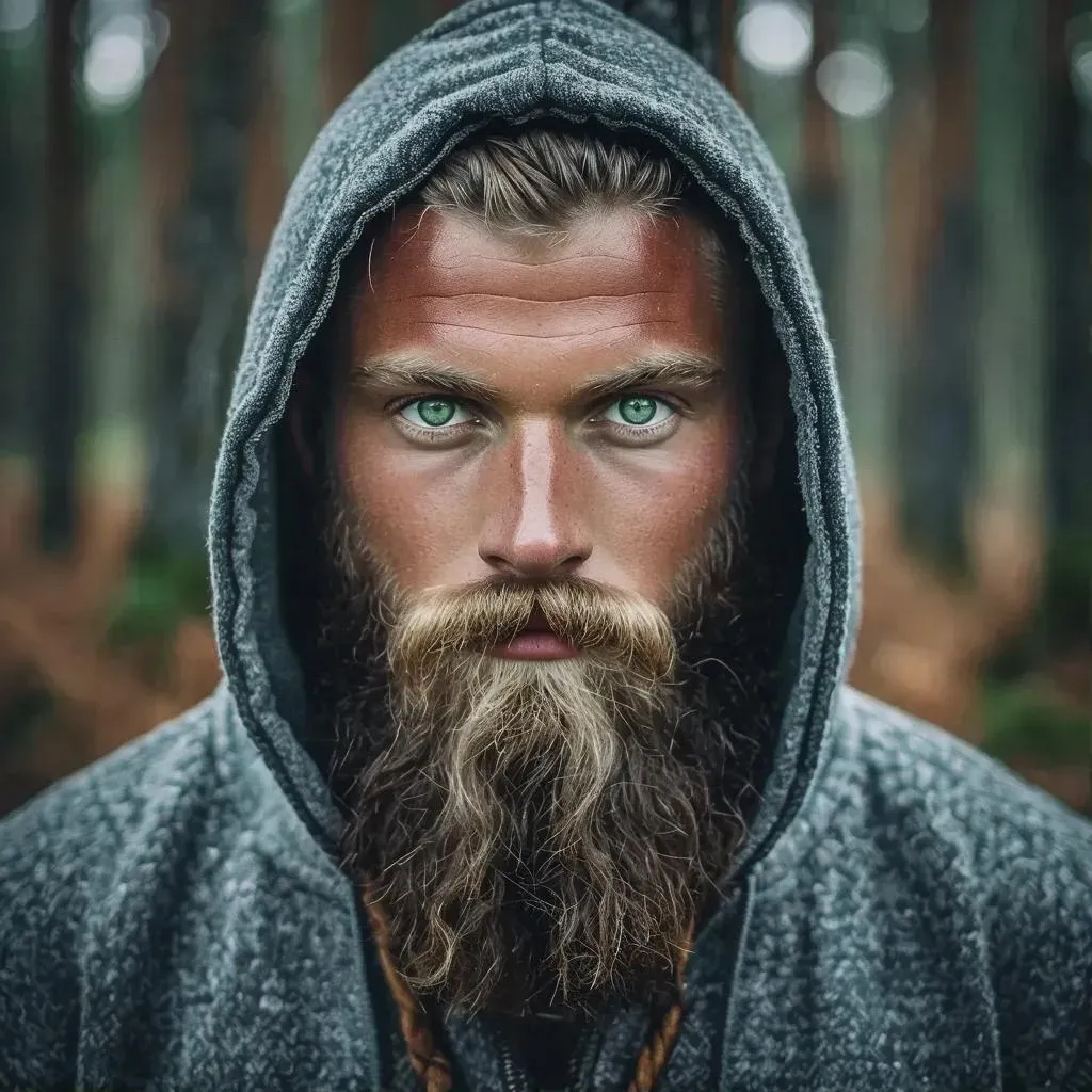 Create a hauntingly realistic AI-generated Viking portrait with a bearded man in mystical woods. Featuring striking green eyes, a long face, and hoodie, this atmospheric image blends Norse ruggedness with modern style. Perfect for fantasy art, book covers, or historical reenactments. Generate professional-grade visuals effortlessly using Vivago.ai's advanced AI image generator tools.
