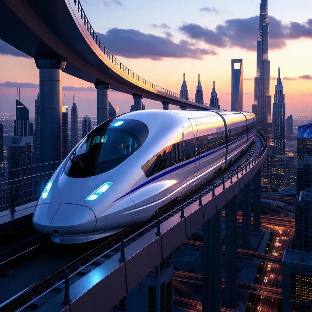 Generate a futuristic high-speed train with sleek silver, black, and blue-lit designs racing through a multi-level glass overpass. Explore AI-powered visuals of a sprawling metropolis blending modern skyscrapers, dusk city lights, and vibrant sunset skies—perfect for tech-forward, dynamic imagery symbolizing innovation and urban progress. Create stunning AI-driven scenes with Vivago.ai's advanced tools.