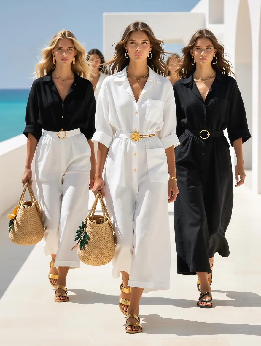 Models walk along a bright, Mediterranean-inspired runway wearing breezy black and white linen dresses, tunics, and coordinated resort sets. The silhouettes are playful yet elegant: . The fabric is lightweight and breathable, moving effortlessly in the summer breeze. Accessories bring in resort glamour, golden sandals, straw bags with Greek motifs, and subtle metallic jewelry inspired by seashells, olive leaves, and ancient coins. Hairstyles are natural and carefree — sun-kissed waves, messy buns, or braids with ribbon accents.