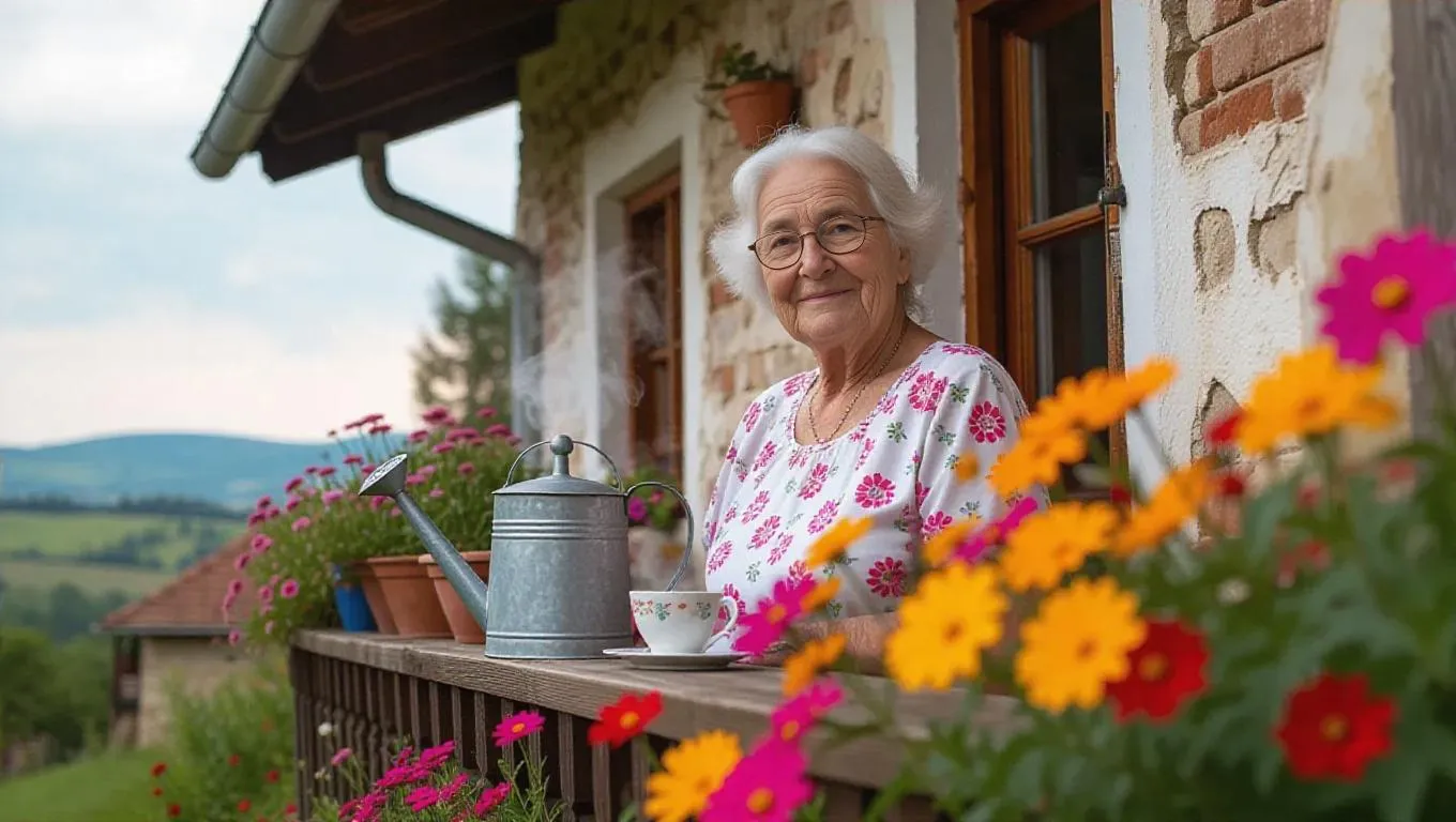 Capture the serene charm of a quaint Hungarian village with this AI-generated scene: an elderly woman smiles on a flower-filled terrace, vintage watering can and steaming coffee beside her. Perfect for evoking countryside nostalgia through AI image generation tools that transform prompts into vivid, detailed visuals.