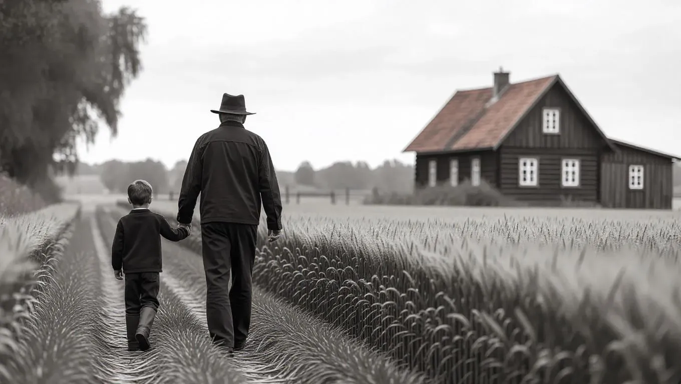 Generate a striking black-and-white AI image of an American man holding hands with a German boy in a serene countryside. Vivago.ai transforms text prompts into emotive visuals with vintage monochrome styles, evoking timeless emotions. Perfect for storytelling or artistic projects with professional-grade editing tools for cultural contrast and nostalgic rural ambiance.