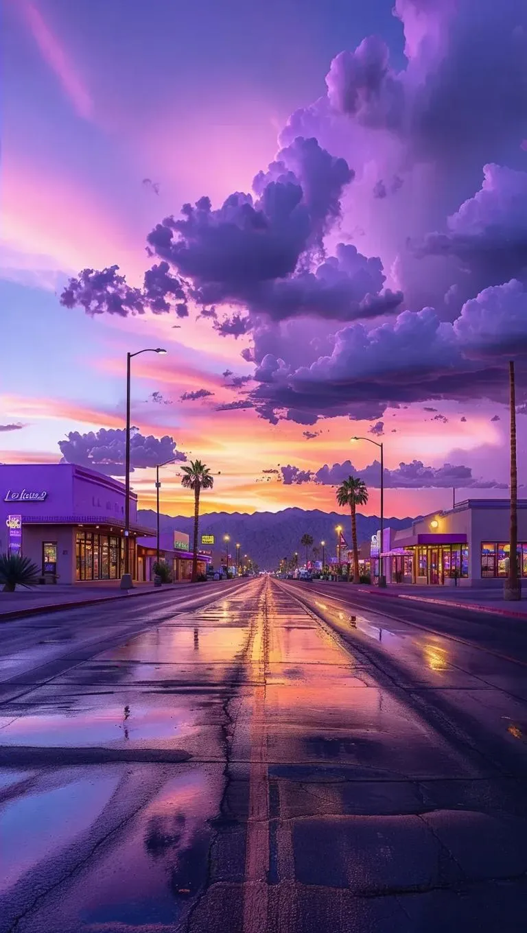 Generate a serene American Desert City nightscape with AI. Wet streets reflect a soft Lofi-style lilac glow, dark windows, and lavender-lit buildings under intense rain clouds. Create calm, peaceful visuals using vivago.ai's AI image tools for professional-grade, atmospheric results.