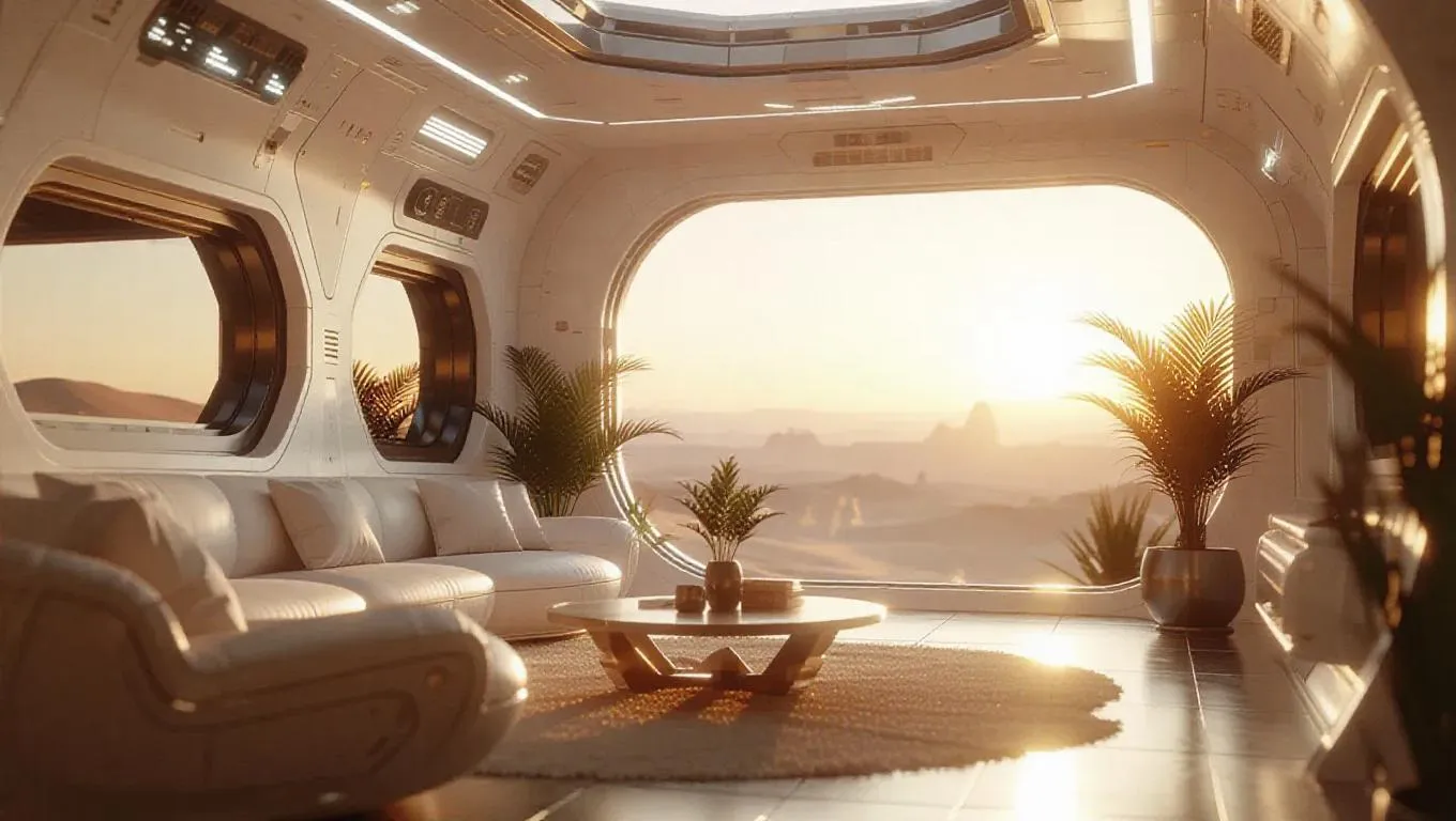 High quality, 8K, Ultra HD, Highly detailed, High contrast, Perfect and Detailed Environment, Perfect Furnitures and Furnishing, Perfect Cinematic close-up photo, sunset. Bionic style space station interior design on the alien planet surface: 1.0 > Beige futuristic high-tech bionic living room, SD2.1_2.1realismEngine_v10, close-up, hyper-detailed, sharp focus, studio photo, intricate details, sleek lines, minimalist aesthetic, metallic accents, daylight, reflective surfaces, soft shadows, ambient lighting, warm tones, futuristic flora, seamless integration, advanced technology, clean and polished.