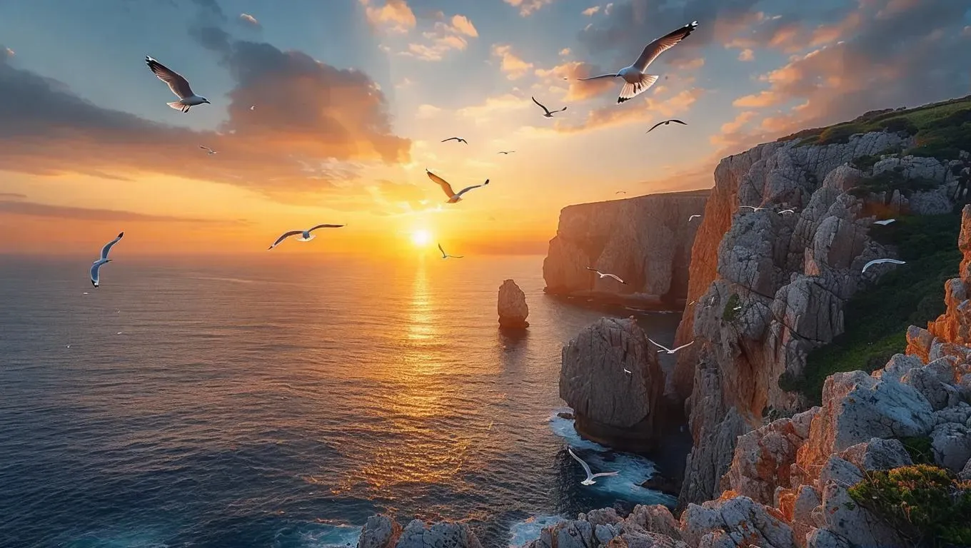 Create stunning AI-generated visuals of a majestic seaside cliff with crashing waves, soaring seagulls, and panoramic ocean views. Perfect for coastal-themed designs, travel content, or nature-inspired projects using VivaGo's advanced image generation tools.