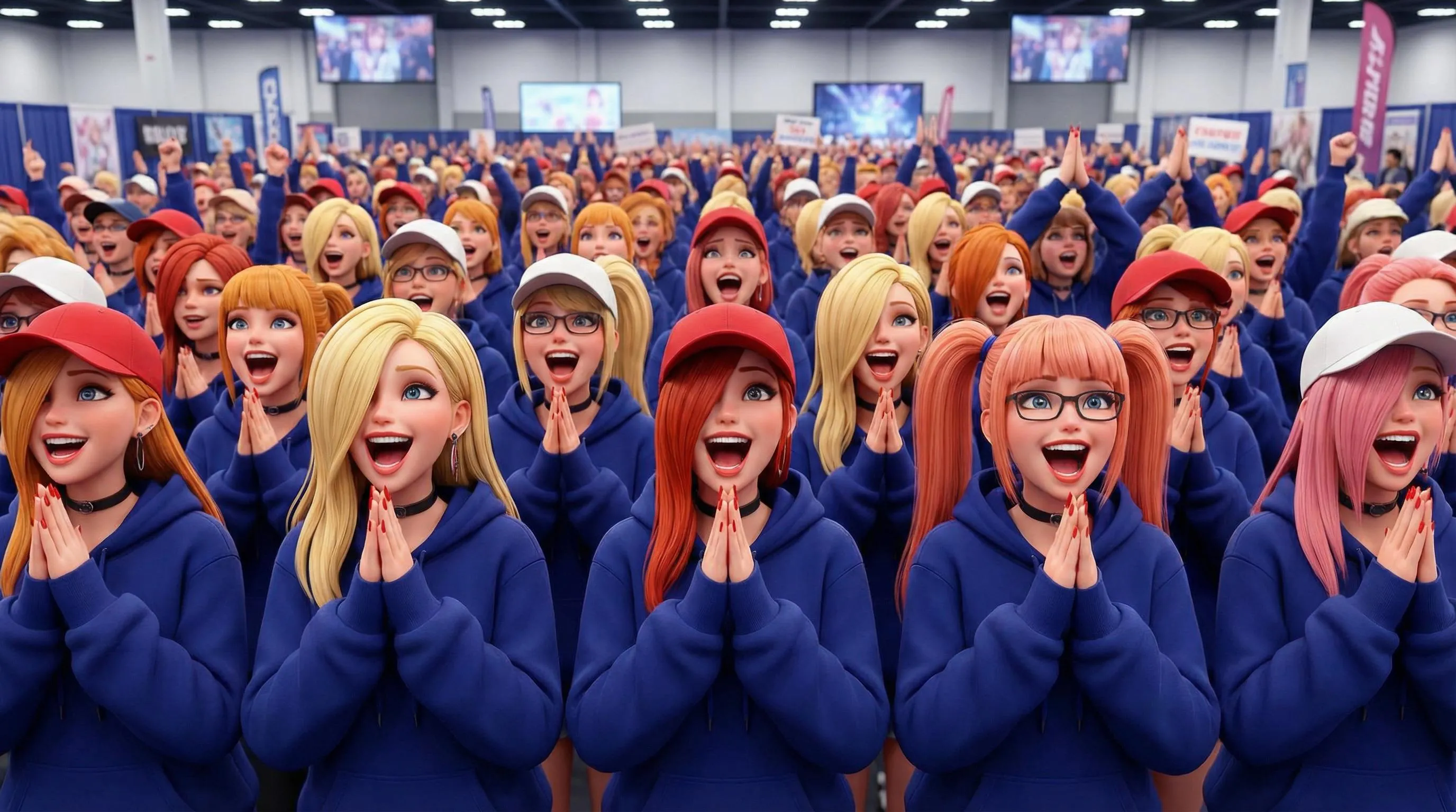 Generate lively CGI anime women inspired by Final Fantasy with vibrant multicolored hair & side-swept styles. Adorned in deep blue moe-sleeve hoodies hiding hands, red/white hats, chokers, skirts, & long nails. Capture their elated expressions, admiring prayer pose, & joyful screams in this vibrant digital art scene. Perfect AI anime character creation.