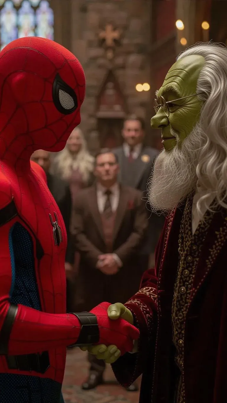 Spiderman shaking hands with Dumbledore who quietly nods with a small grin and shrek is in the shot too