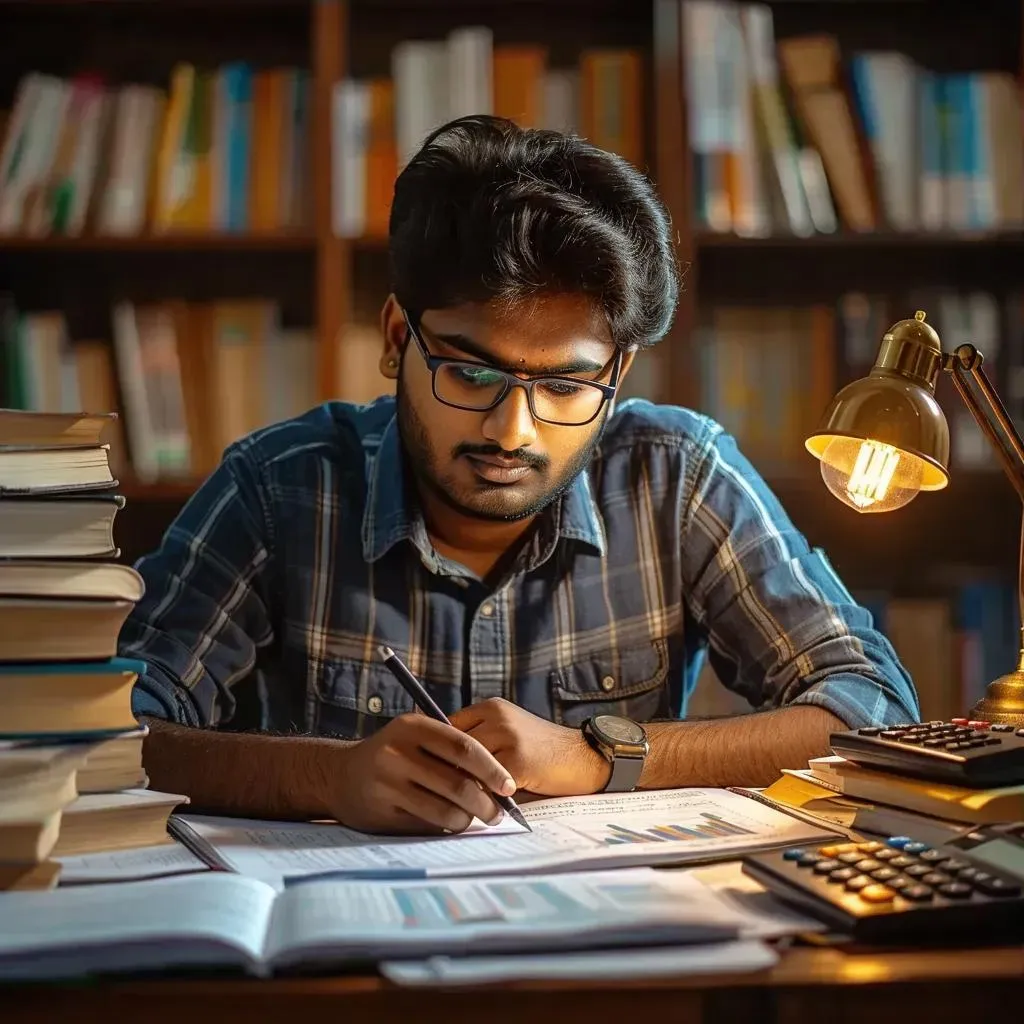 Generate a professional Instagram profile photo with AI-powered visuals of a dedicated CA aspirant studying under a lamp, surrounded by CA books and a calculator. Perfect for showcasing exam preparation, academic commitment, and motivation using curated AI effects for polished, high-quality imagery.