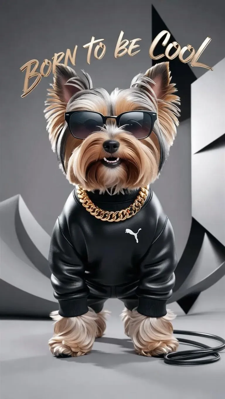 Explore dynamic AI-generated 3D art of a stylish Yorkie puppy in a sleek black Puma outfit, gold accessories, and chic sunglasses. Set against a monochromatic backdrop with bold "Born to be Cool" text—perfect for urban fashion visuals, pet portraits, and charismatic AI-generated content blending high-end style with playful charm.