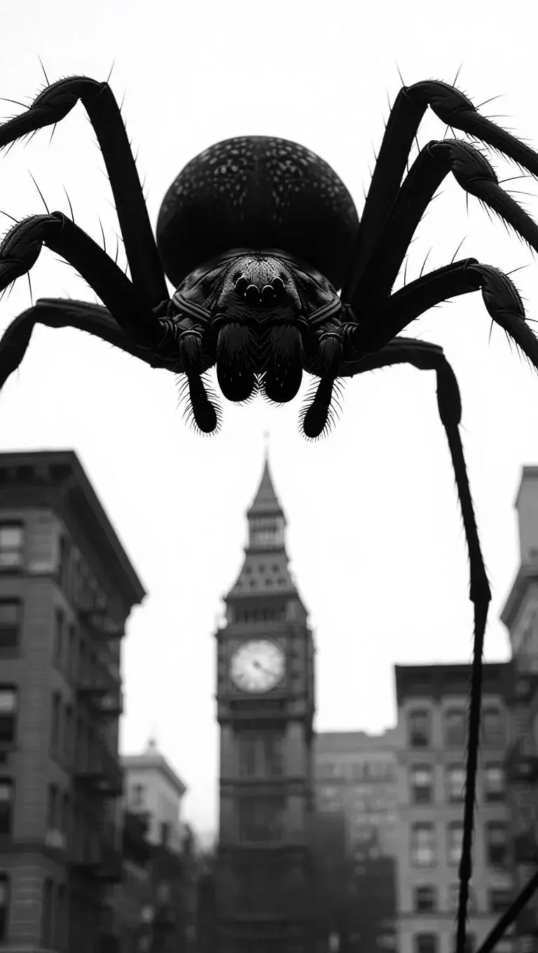 Dark spider noir with amazing pose in black and white retro city, looks mysterious