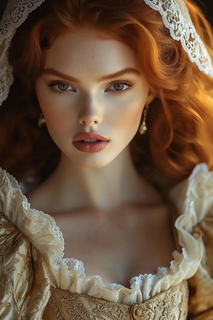 AI-generated Elizabethan portrait of an auburn-haired model in intricate gowns. Ultra-High Resolution, Texture Mapping, and Ambient Light enhance lifelike realism for face shots. Ideal for historical fashion visuals, detailed texture rendering, and vibrant AI artistry with professional-grade precision.