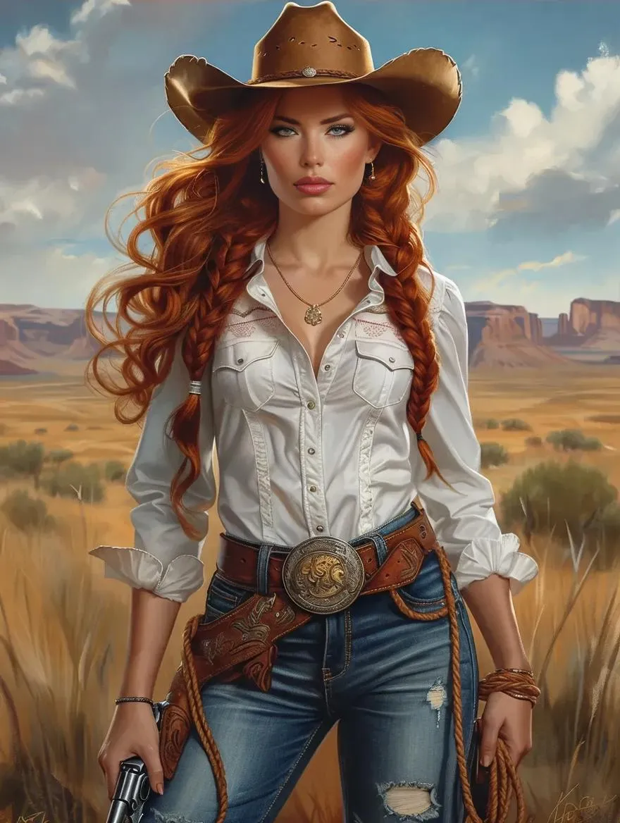 Create dynamic AI-generated Western characters with vivid details: fiery redhead cowgirl in chaps, hat, and boots, wielding a lasso and revolver. Full-body design features a braided ponytail, bandolier, and authentic Western styling. Explore AI tools for lifelike, professional-grade cowboy-themed art or photos. Perfect for storytelling, concept art, or Western-inspired visuals.