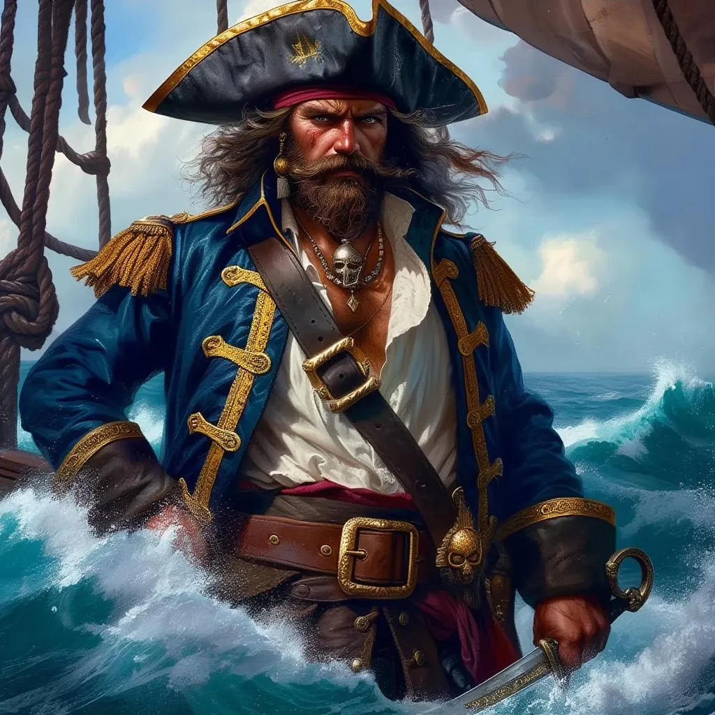 Generate a fierce pirate captain AI image with vivago.ai. Craft detailed visuals of rugged adventurers, treasure maps, and stormy seas using text prompts. Design custom characters with dramatic lighting, intricate costumes, and parrot companions. Perfect for storytelling, gaming, or concept art. Explore AI tools for lifelike textures, tattered coats, and weathered faces. Transform ideas into professional pirate-themed visuals instantly.