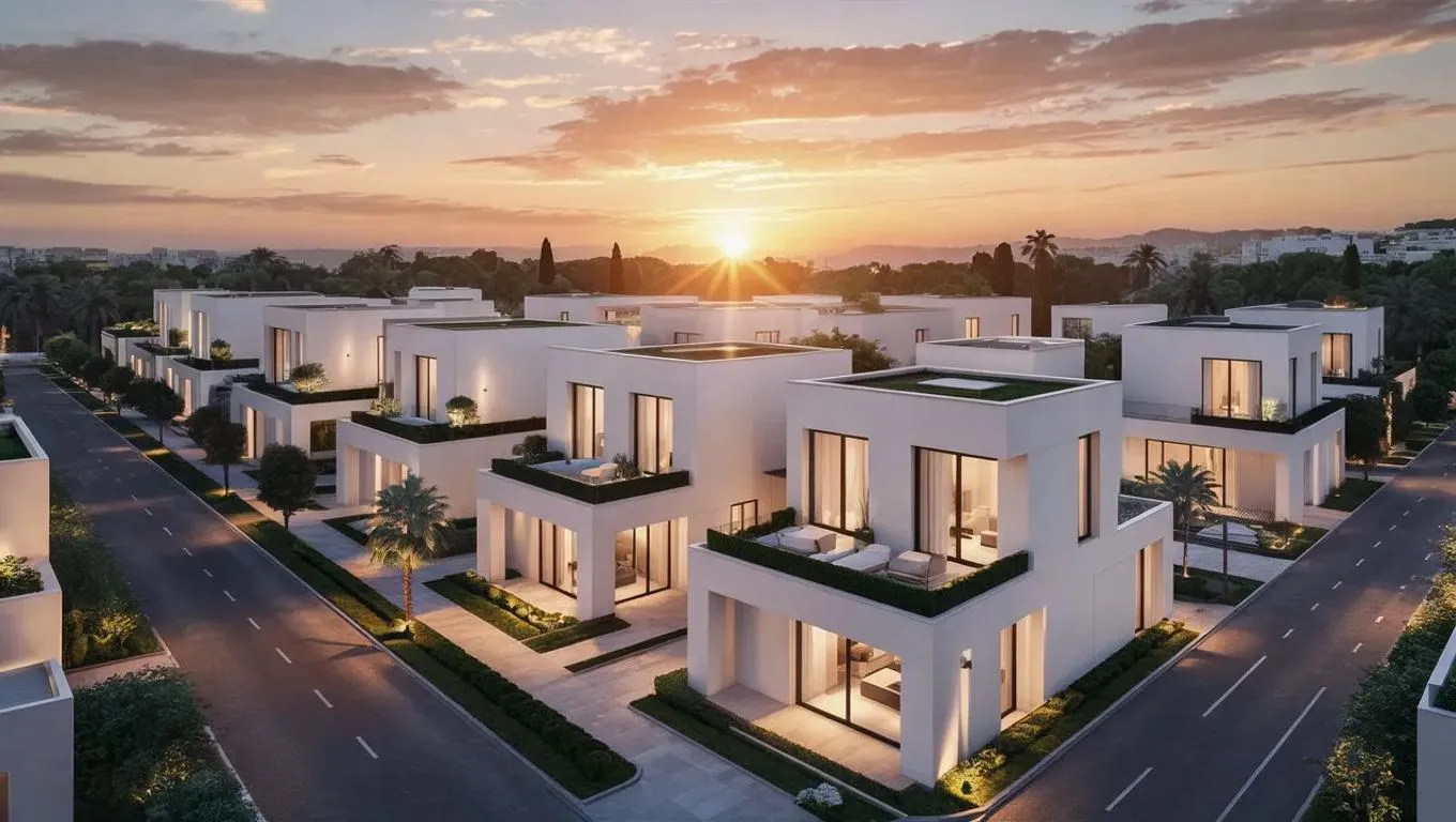 Generate stunning aerial views of 500 modern Spanish-inspired 3-story white townhouses with sleek infrastructure, captured at sunrise with dynamic shadows. Perfect for urban visualization, architectural projects, or AI-generated cityscapes blending elegance and contemporary design. Ideal for creators seeking vibrant, detailed AI-powered urban scene renders.