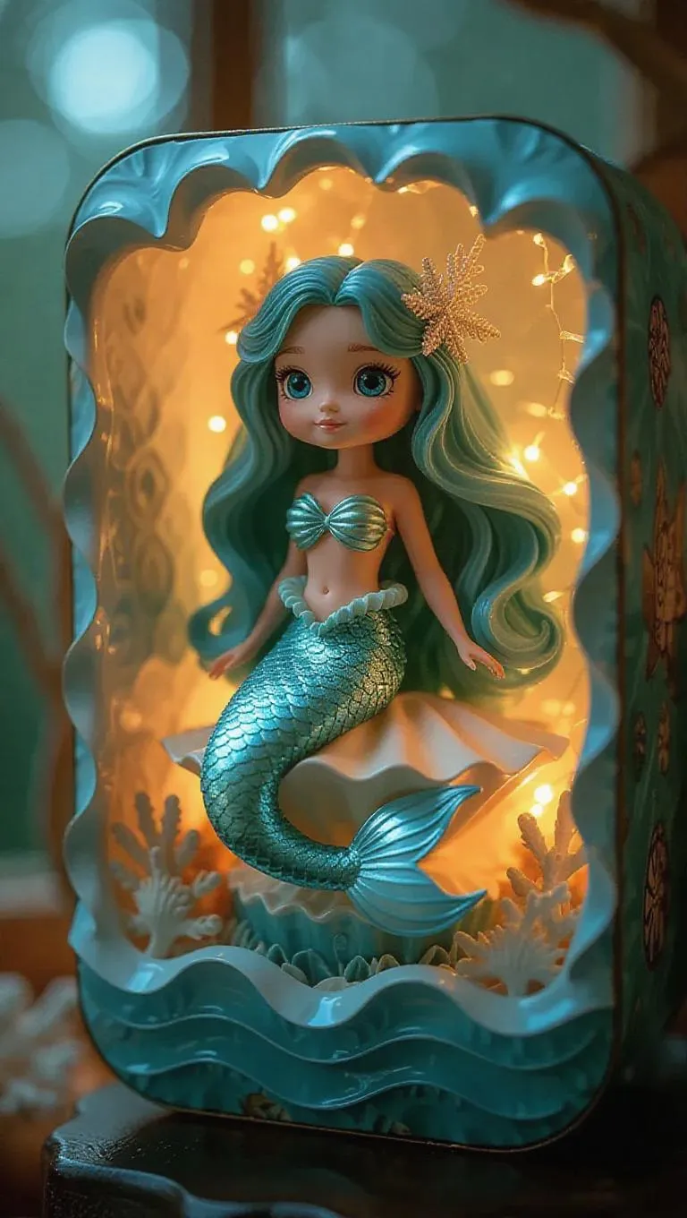 Craft a whimsical AI-generated toy mermaid with iridescent scales and sea-green hair, perched on a shell-shaped rotating base. Features underwater fantasy packaging with wave textures, story card, and serene seaside factory glow. Ideal for magical, pastel-toned visuals blending realism and soft lighting in AI-powered creative designs.