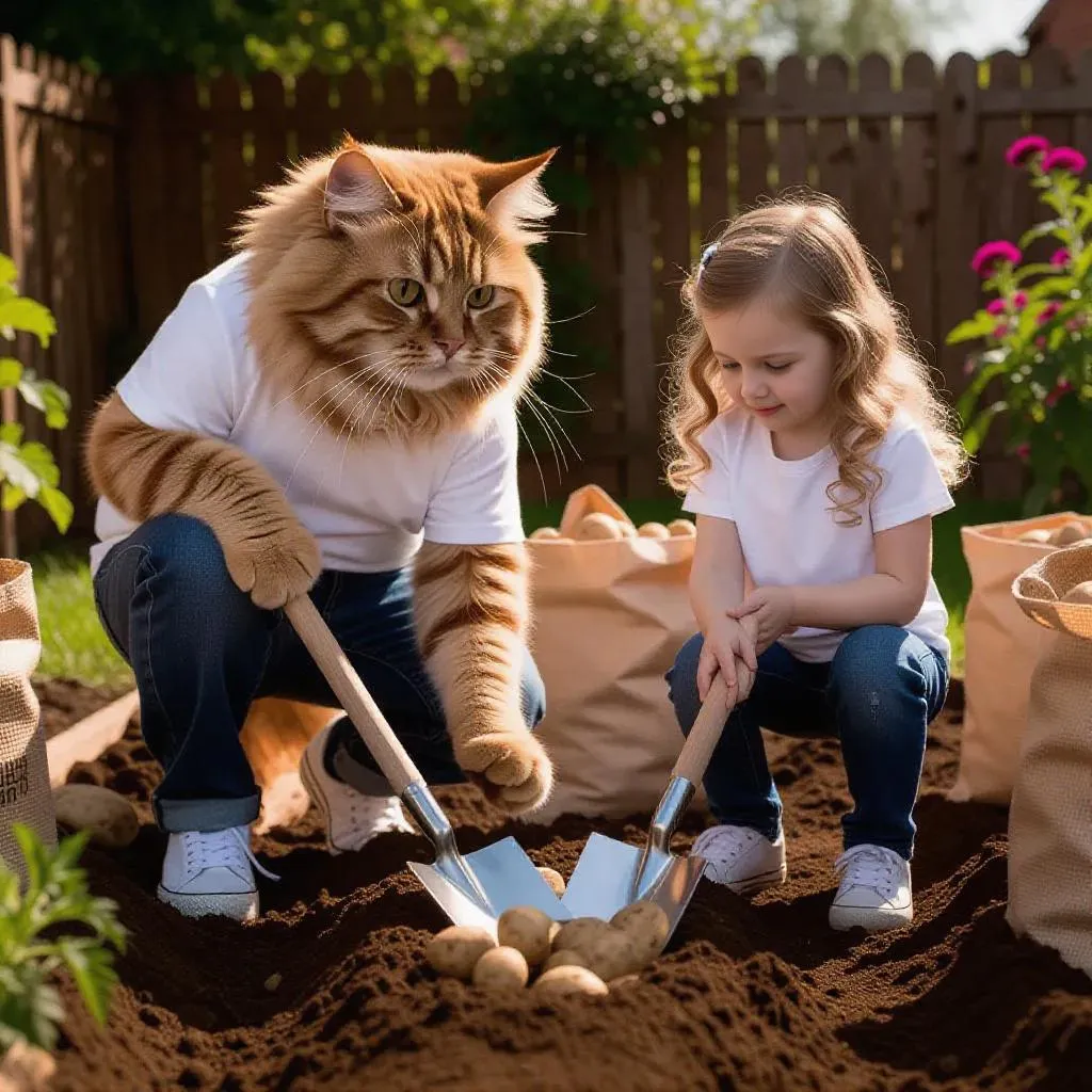 AI-generated image of an anthropomorphic fluffy ginger cat with a human body and a blonde toddler planting potatoes in a garden. High-resolution photo featuring detailed outfits, shovels, potato bags, and buckets. Vibrant scene blending whimsical anthropomorphism with farm activity, created via AI tools for vivid, imaginative visuals. Perfect for creative storytelling or unique digital art projects.