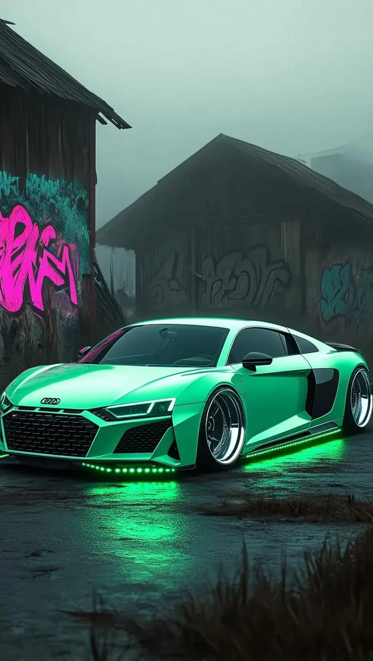 Experience AI-generated futuristic sports car imagery with this 2025 Audi R8-inspired concept in vibrant mint green. Featuring chrome rims, slim tires, and neon underglow, set against a dystopian backdrop of foggy ruins and graffiti-covered walls. Perfect for automotive enthusiasts seeking edgy, AI-powered visualizations blending sleek design with post-apocalyptic atmosphere.