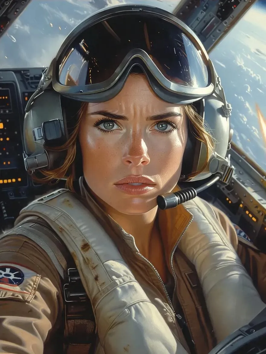 Close-up of a Rebel Alliance pilot in an X-wing cockpit, intense space battle backdrop. Ultra-HD AI image captures her worried expression, weathered helmet, and dim instrument glow. Texture mapping enhances realism, soft illumination highlights determined face. Generate cinematic Star Wars scenes with AI effects for vivid, professional-grade sci-fi visuals.