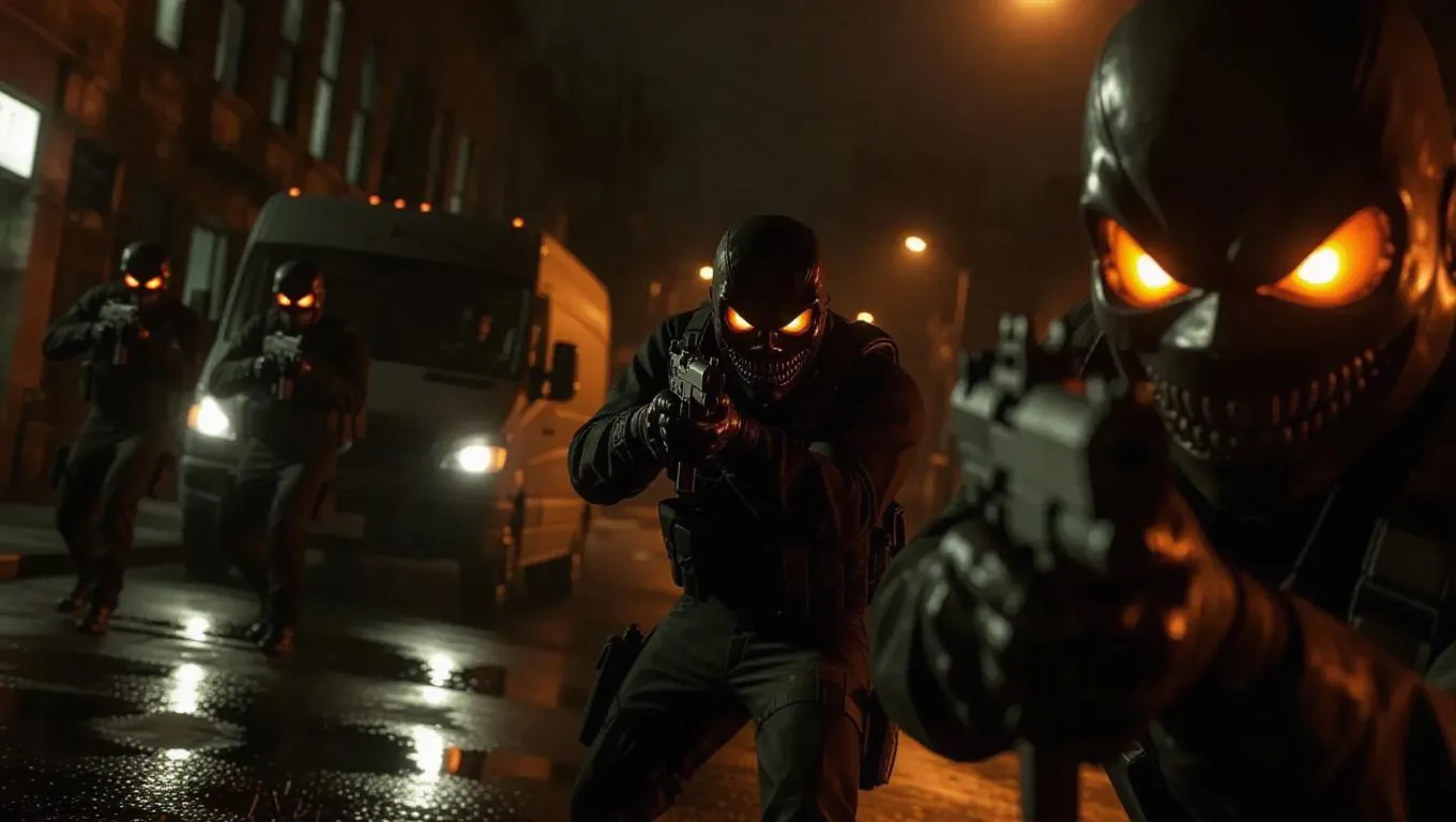 Vivago.ai crafts intense GTA-style heist scenes with AI: armed robbers in Halloween masks ambush an armored van on a dark, deserted street. Dynamic low-angle shots, dramatic lighting, and tilted frames amplify tension, capturing cinematic danger and gothic atmosphere for professional-grade AI-generated visuals.