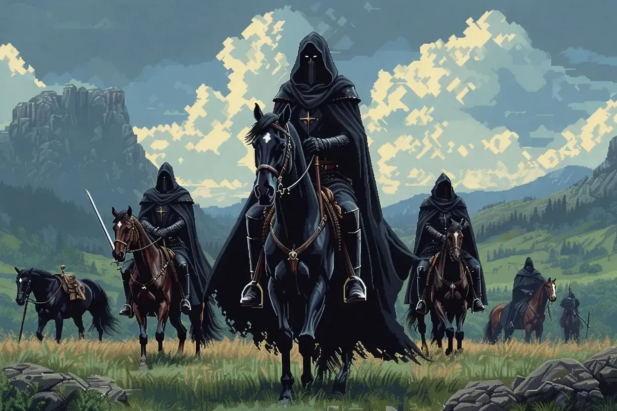 Step into a retro dark fantasy realm with AI-generated 1980s MS-DOS pixel art. Craft haunting Nazgûl riders on horses in a Lord of the Rings-inspired 8-bit style. Perfect for gamers and Tolkien fans, blending vintage aesthetics with dark, hooded figures. Vivago.ai transforms prompts into nostalgic, eerie visuals for indie games, merch, or pixel-art tributes.