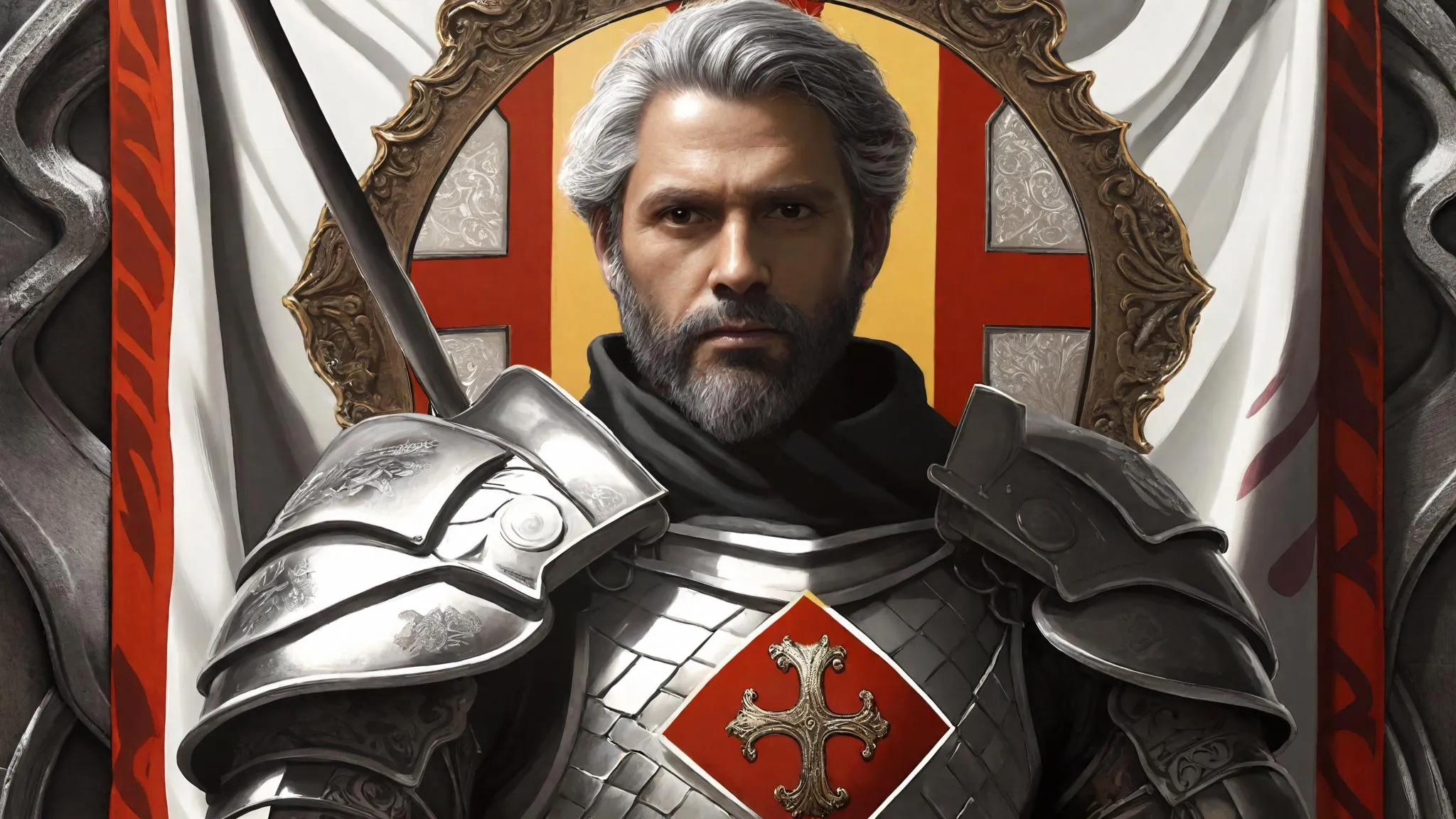 Create a striking Hispanic knight in intricately detailed armor with leon motifs using AI. Featuring muted tones, matte texture, and Gothic architecture, this contemplative pre-battle scene blends fashionable gray tones with a majestic flag bearing a red cross. Perfect for professional AI-generated visuals combining historical grandeur and modern stylistic effects.