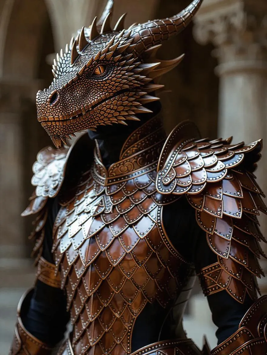 Generate striking AI visuals of dragon scale armor in chocolate-brown and white-tan hues. Perfect for fantasy art, game characters, or cosplay concepts, combining intricate armor textures with earthy tones using Vivago.ai's AI image generation tools for professional-grade creative projects.