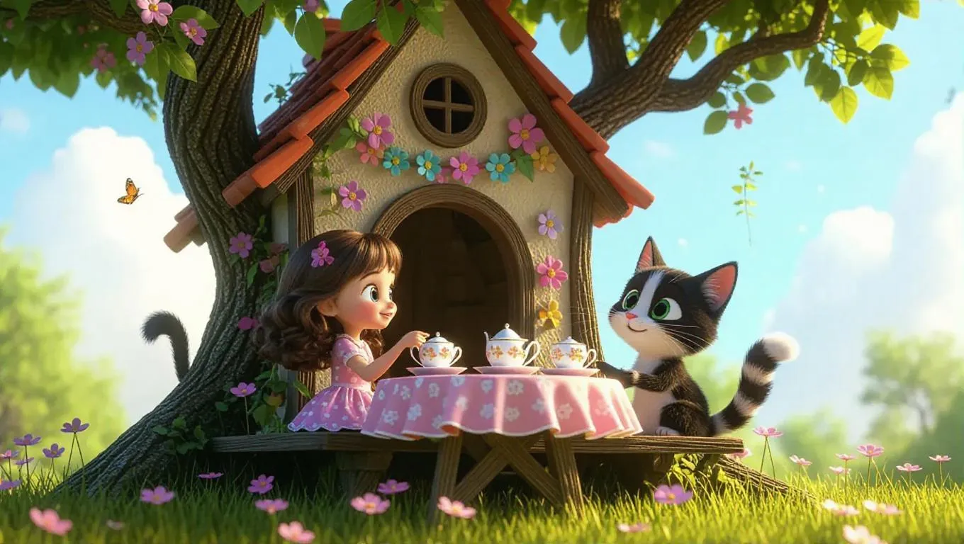 Create a vibrant AI-generated image of a whimsical treehouse tea party with a cheerful girl and her talking animal companion. Perfect for magical storytelling or playful visuals, crafted using vivago.ai's AI effects for enchanting, colorful scenes that spark imagination and joy. Ideal for children's content, fantasy themes, or whimsical art projects.