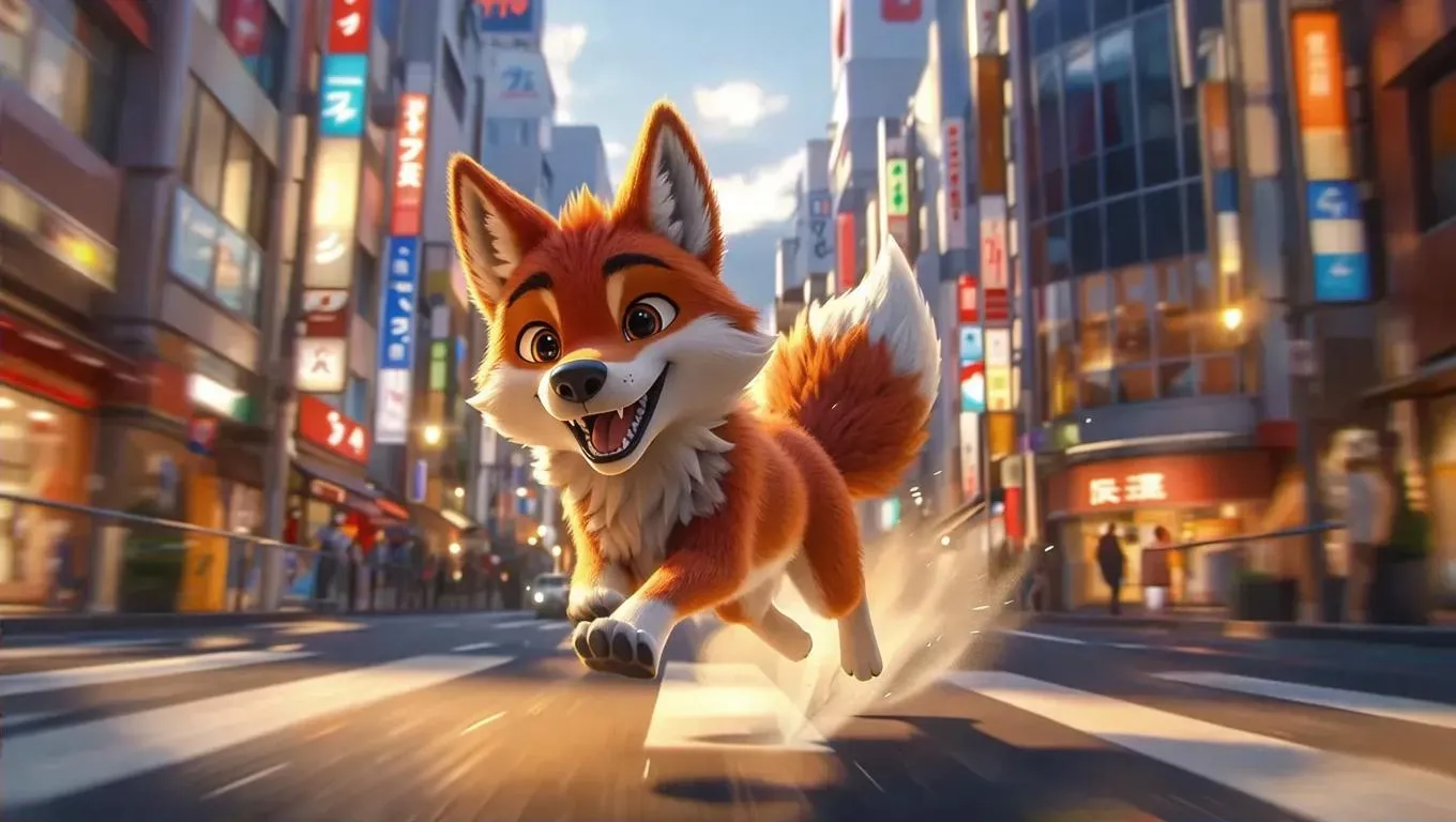 Create a cheerful 3D anime-style red wolf character running through a vibrant cityscape with vivago.ai's AI tools. Generate dynamic cartoon scenes, indoor lighting effects, and lively urban animations for professional-grade, happy character designs in vivid 3D rendering.
