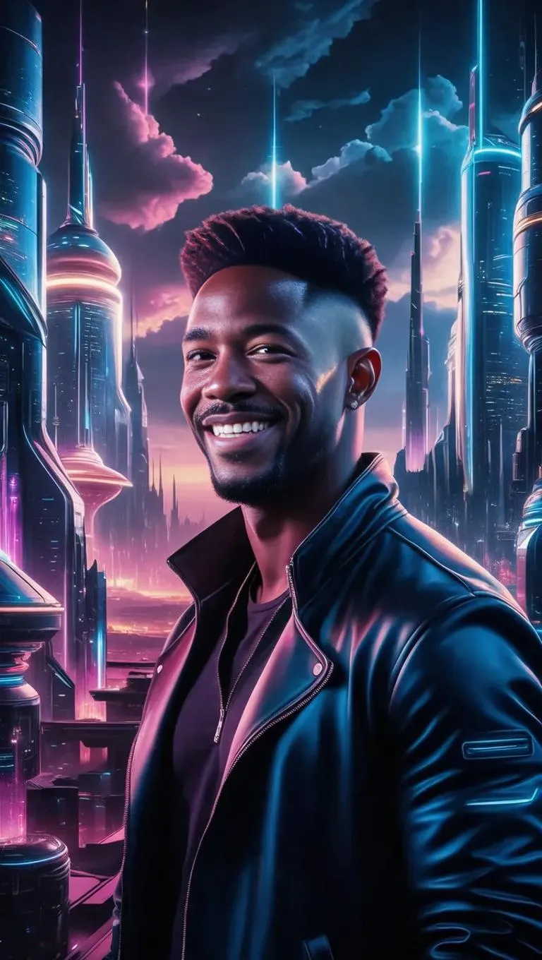 Generate a hyperrealistic cyberpunk scene featuring a man with a captivating smile against a neon-lit futuristic metropolis. Vivago.ai merges mystic fantasy elements with AI image generation, crafting surreal cityscapes, futuristic character designs, and cyberpunk aesthetics for immersive visual storytelling. Elevate digital art with cutting-edge AI effects and professional-grade creative tools.