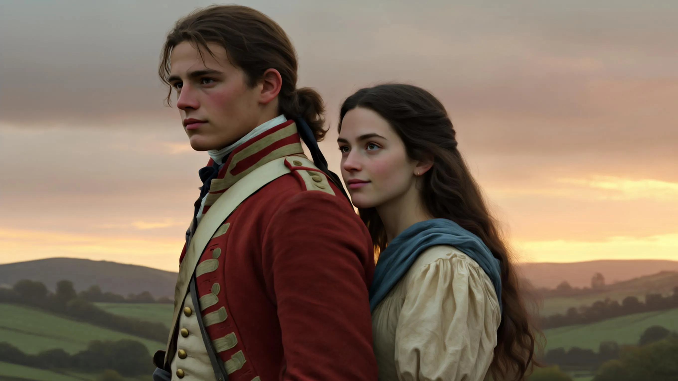 A young British redcoat, aged 22, with brown shoulder-length hair tied back and a clean-shaven face, wears a worn redcoat uniform. He walks alongside a young English woman, age 20, who has long dark brown hair and wears a cream dress with a blue shawl. They embrace, gazing peacefully at the nearby hills during a serene sunset over the English countryside. The scene captures a romantic, calm atmosphere in an 18th-century pastoral landscape, with cinematic lighting and an oil painting style, emphasizing highly detailed and realistic imagery.