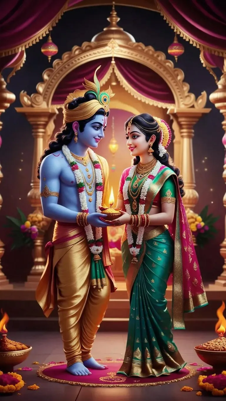 Explore AI-generated visuals of Lord Krishna and Satyabhama celebrating Diwali's Festival of Lights. Craft divine, vibrant imagery with advanced text-to-image AI tools for cultural storytelling, spiritual content, and professional-grade results. Perfect for dynamic, high-quality depictions of Hindu traditions and festive celebrations.