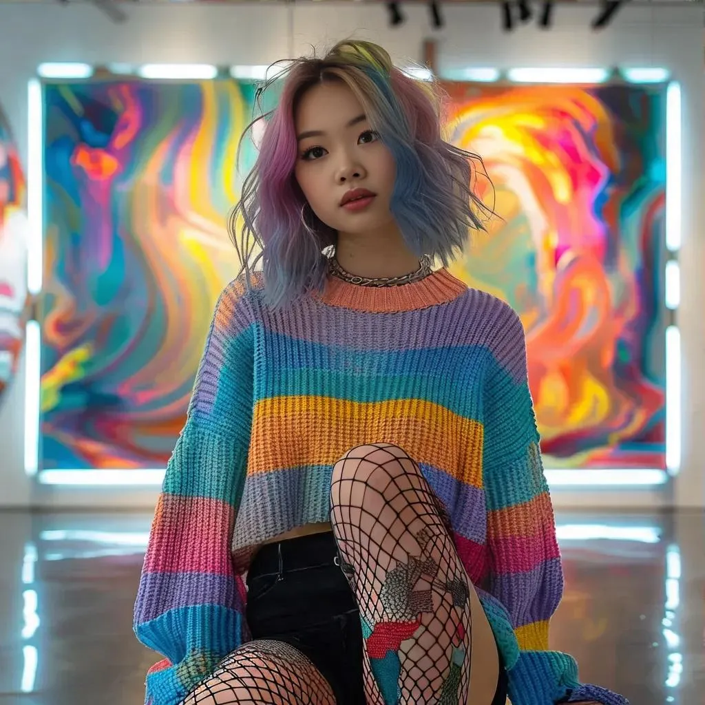 Create vibrant AI-generated visuals of trendy fashion with vivago.ai. Transform prompts into edgy, artistic scenes: colorful ombre hair, oversized sweaters, fishnet stockings, platform sneakers, and modern gallery backdrops. Ideal for bold, creative content blending streetwear and contemporary art aesthetics using advanced AI image/video tools.