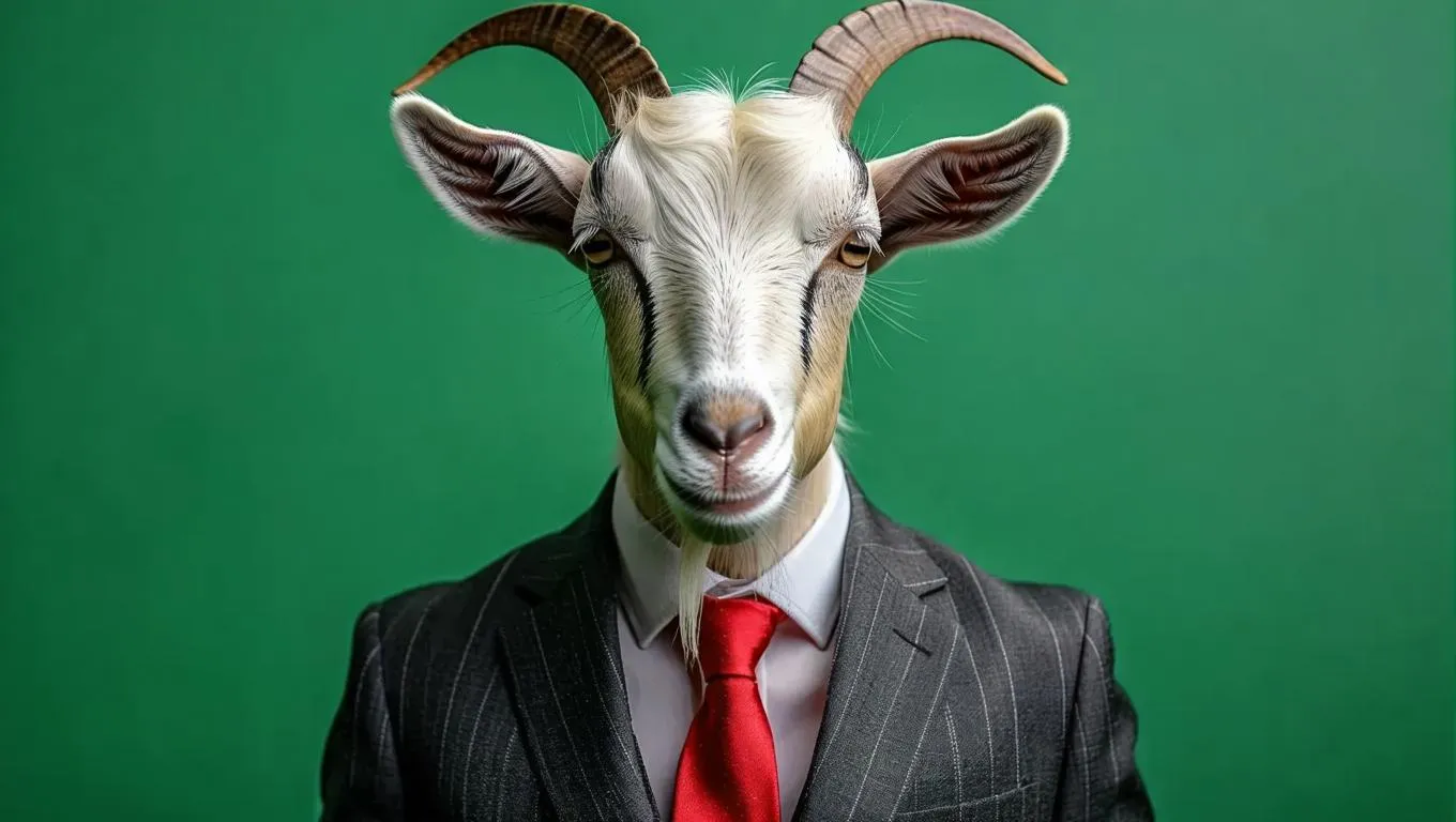 Generate a striking AI image of a white goat in a sleek dark suit and red necktie against a vivid green backdrop. Perfect for creative projects, ads, or social media. Use Vivago.ai’s AI tools to craft professional, eye-catching visuals from text prompts, blending humor and sophistication effortlessly.