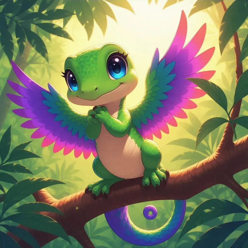 Create a whimsical cartoon Gecko-mon with avian features using vivago.ai's AI image generator. Design a unique bird-type hybrid creature adorned with vibrant feathers and dynamic wings. Transform text prompts into professional-grade visuals with advanced AI effects and editing tools for captivating creature designs.