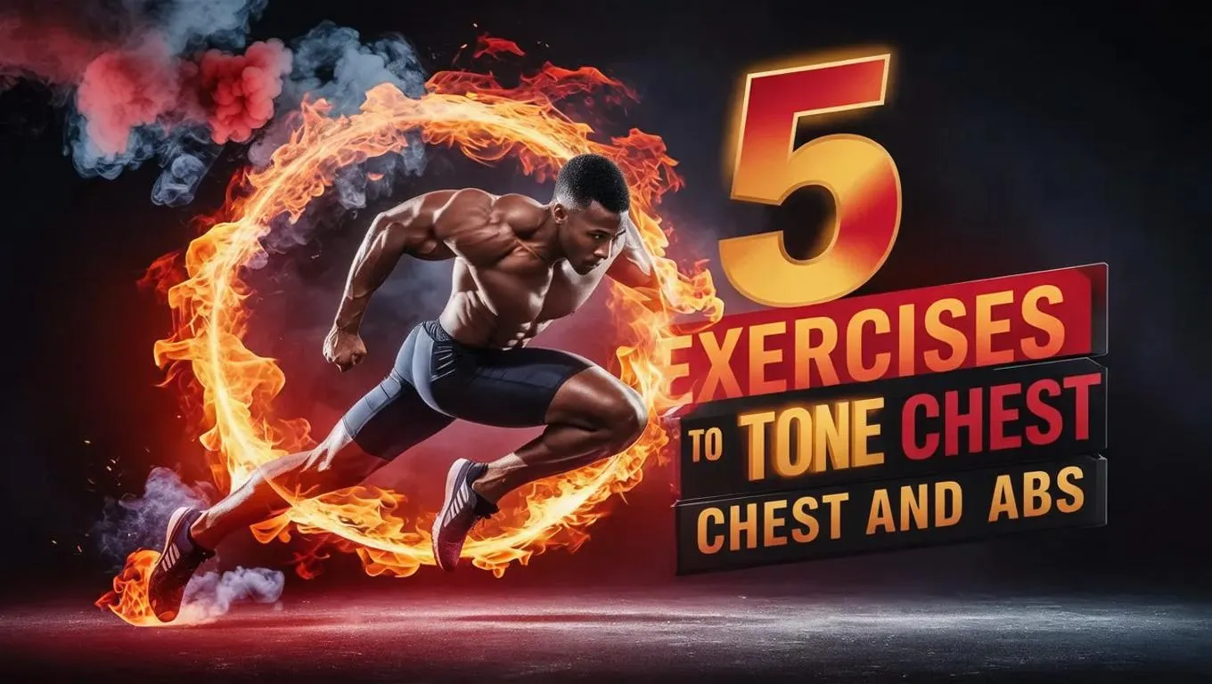 Design a dynamic 16:9 thumbnail with explosive energy! Fit athlete mid-sprint or jump, surrounded by fiery flames/smoke, bold "5 Exercises To Tone Chest & Abs" text, vivid red-orange-yellow gradients. Countdown timer in corner amps urgency. Perfect for fitness videos—high-intensity visuals drive clicks, boosting engagement with powerful, action-packed branding. Ideal for YouTube, social media, workout guides.