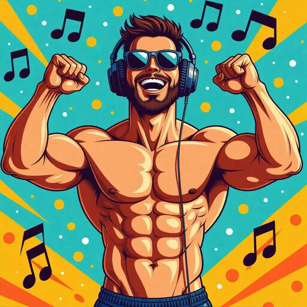 Create vibrant cartoon visuals of a strong shirtless man wearing headphones, surrounded by bouncing music notes. Generate this dynamic AI art instantly with vivago.ai's powerful creative tools. Transform your prompts into professional, eye-catching images effortlessly.
