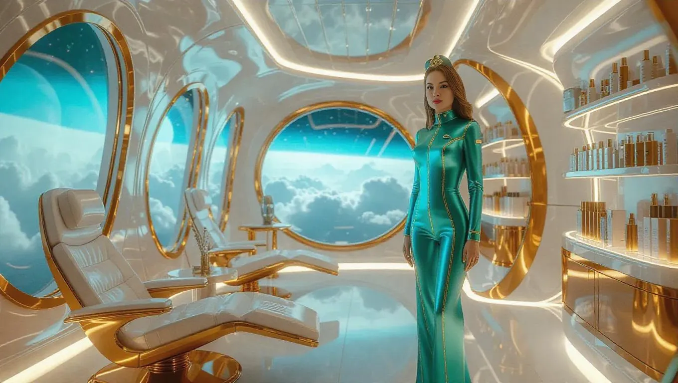 AI-generated luxury spacecraft cabin interior for FEA Cosmetics' photo booth, blending turquoise-gold cosmic nebulae views with anti-gravity shelves showcasing premium products. Features a futuristic cyborg attendant, cream-gold recliners, and magical lighting in strict brand colors (turquoise, cream, gold). Ultra-detailed 8K photorealistic design optimized for large-format printing, emphasizing cinematic textures and studio-grade luxury aesthetics.