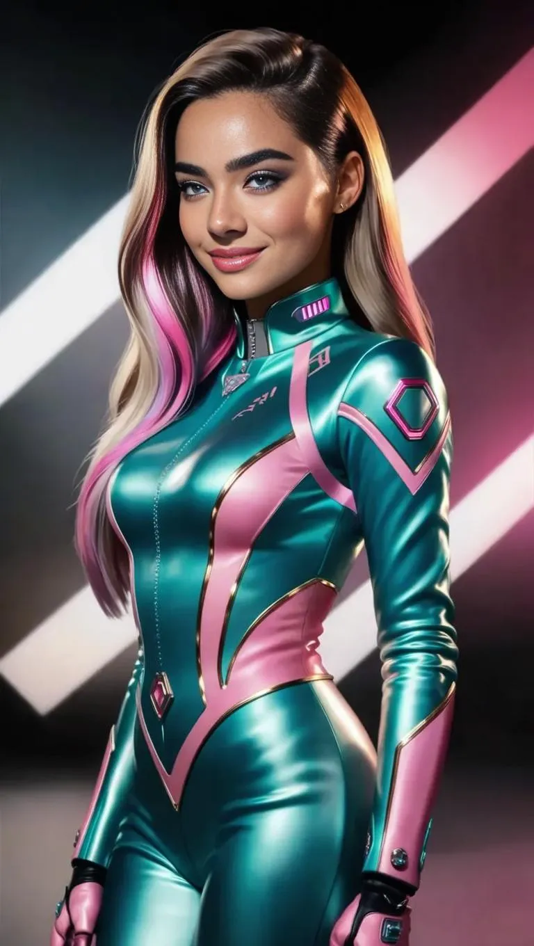 Craft hyperrealistic AI visuals with a futuristic teal-pink suit, long light brown hair with pink-blonde highlights, and silk-textured strands. Highlight detailed facial features—blue eyes, soft blush, and a warm smile—in a dynamic side-angle pose. Optimize AI-generated imagery for realism, style, and vibrancy using Vivago.ai’s advanced creative tools. Perfect for sleek, modern character design and high-quality digital art projects.