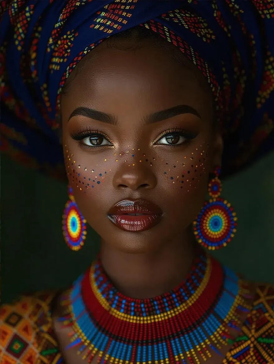 Create stunning hyperrealistic AI art of a glamorous Yoruba girl in vibrant traditional attire, tribal marks, and full makeup. Ultra-detailed 16k masterpiece with studio lighting, vibrant colors, and cultural authenticity for festive visuals. Explore vivago.ai's AI tools.