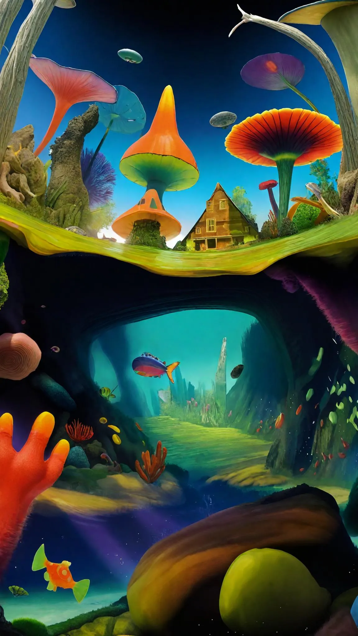 Dive into a mesmerizing AI-generated Cretaceous underwater cityscape, where Eric Carle-inspired psychedelic creatures roam submerged streets. Explore crystal-clear green-blue waters, natural rock formations, and vibrant coral ecosystems through unique submerged camera angles. Create fantastical aquatic worlds with Vivago.ai's advanced AI image tools for surreal, professionally crafted underwater scenes blending prehistoric charm with whimsical visual storytelling.